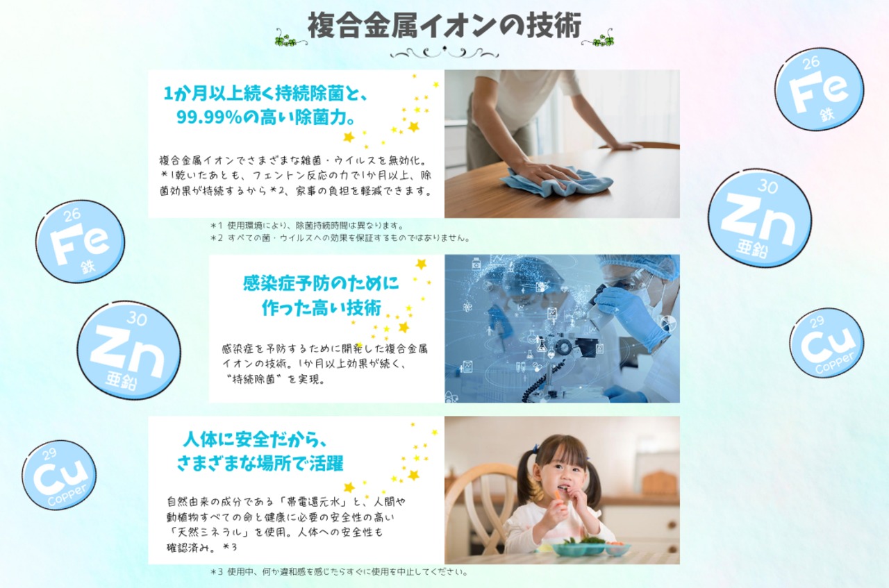 生体の 必須ミネラルである亜鉛・鉄・銅の金属イオンを成分とし、全く新しい観点から生成されました。