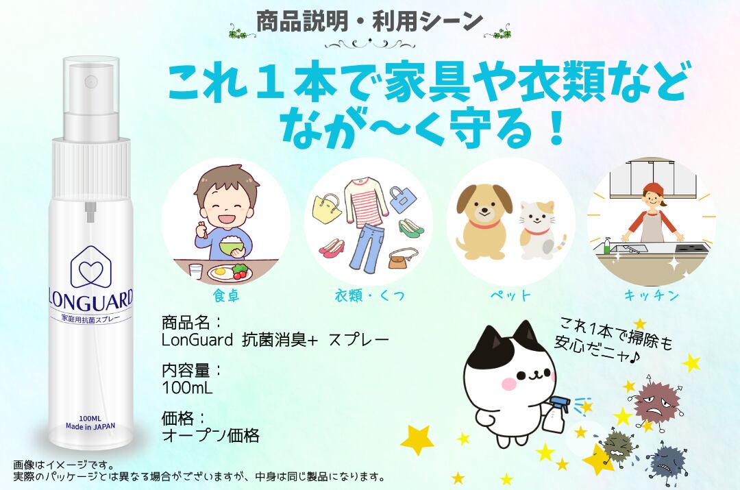 【人体無害】かつ【自己再生機能】を持つ「次世代型複合金属イオン抗菌剤」であるLonGuard【ロンガード】抗菌消臭+は高機能でありながら安心してご利用いただける抗菌コーティング剤です。